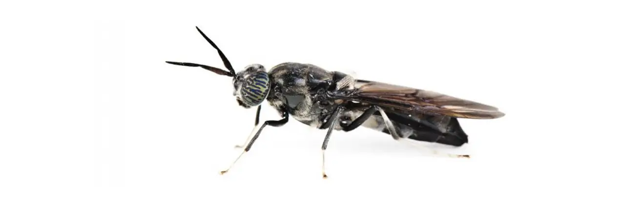 Photographie d’un insecte type : une mouche de l’espèce Hermetia illucens possédant six pattes, deux antennes, un corps divisé en trois parties et deux paires d’ailes dont une paire est réduite à l’état de "balancier" :