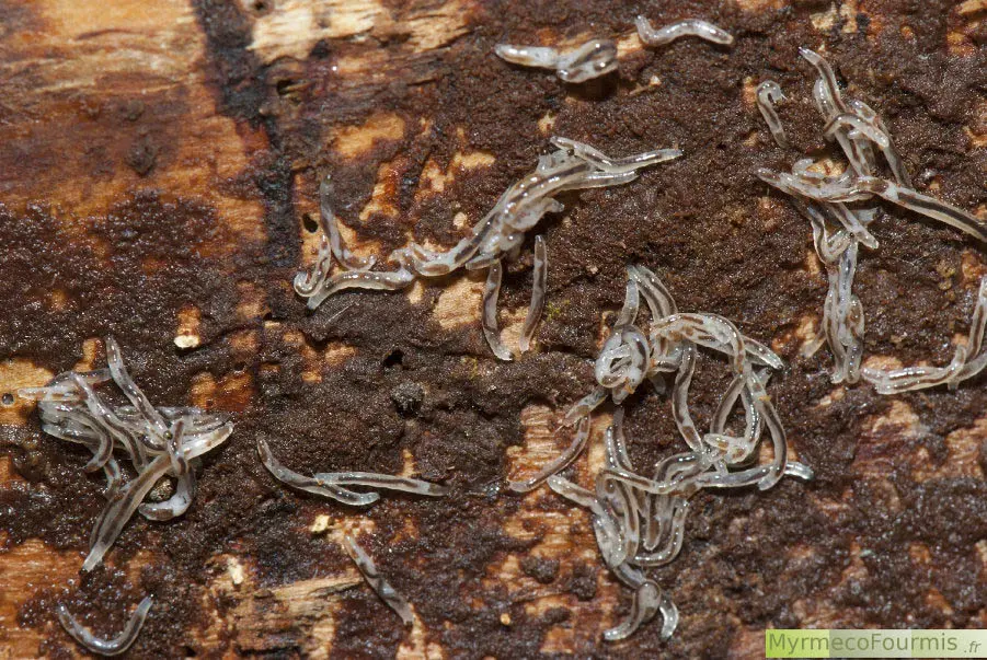 Des larves non identifiées, peut-être de diptères ou de coléoptères, dépourvues de pattes et se nourrissant de bois en décomposition :