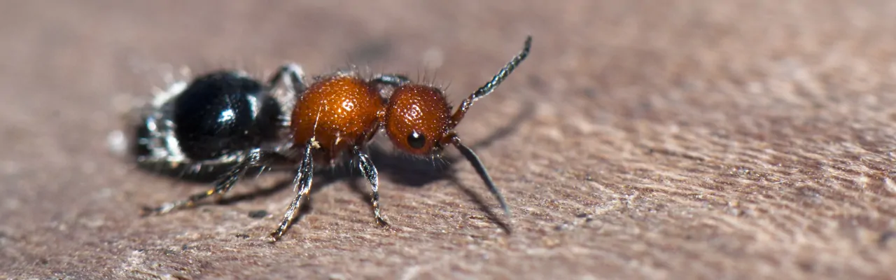 Ne vous y trompez pas : si peu de fourmis "rouges" piquent, les guêpes solitaires de la famille des Mutillidae ne se laissent pas faire. Malgré leur aspect de grosses fourmis poilues, qui leur vaut d’ailleurs le surnom de fourmis de velours en anglais, elles infligent une piqûre douloureuse à celui qui aurait la mauvaise idée d’en tenir une entre ses doigts. On les différencie facilement des fourmis car le thorax des mutilles est entièrement fusionné (on ne distingue pas de segments thoraciques) et que les mutilles ne possèdent pas de "pétiole", sorte de grosse articulation qui fait la liaison entre le thorax et l’abdomen chez les fourmis.